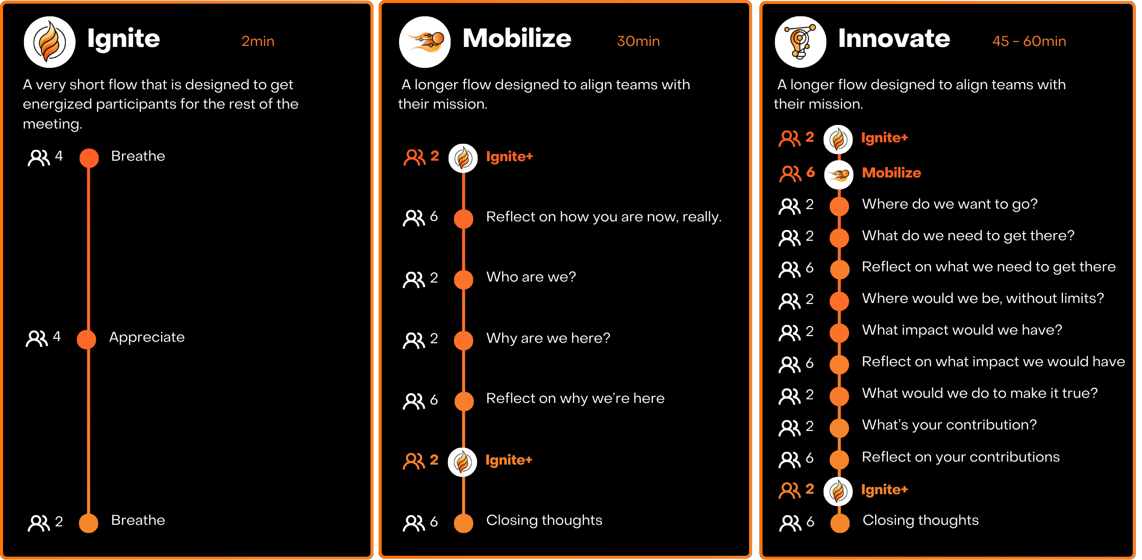 Focus: align on purpose, surface new ideas, and turn insight into action