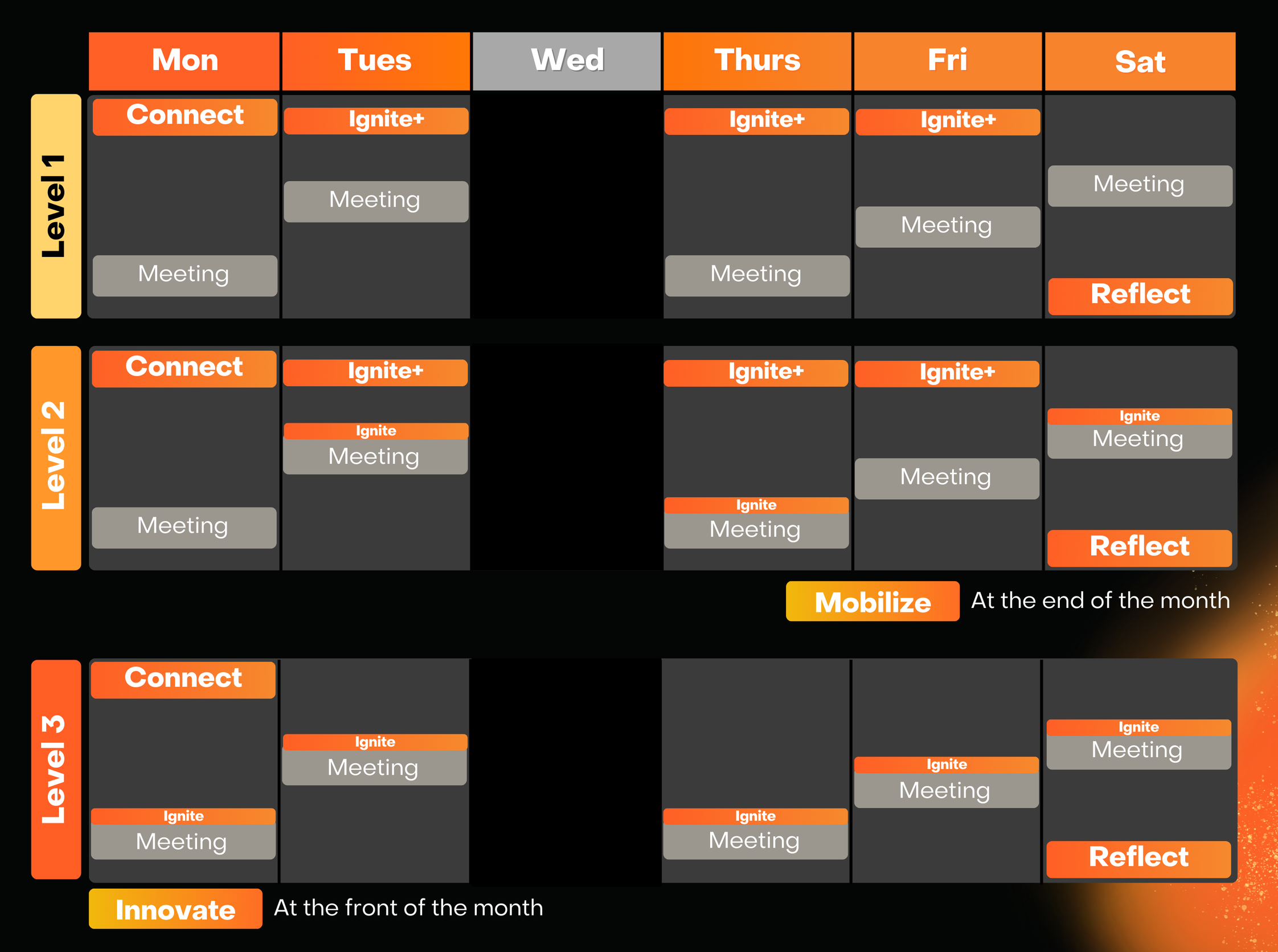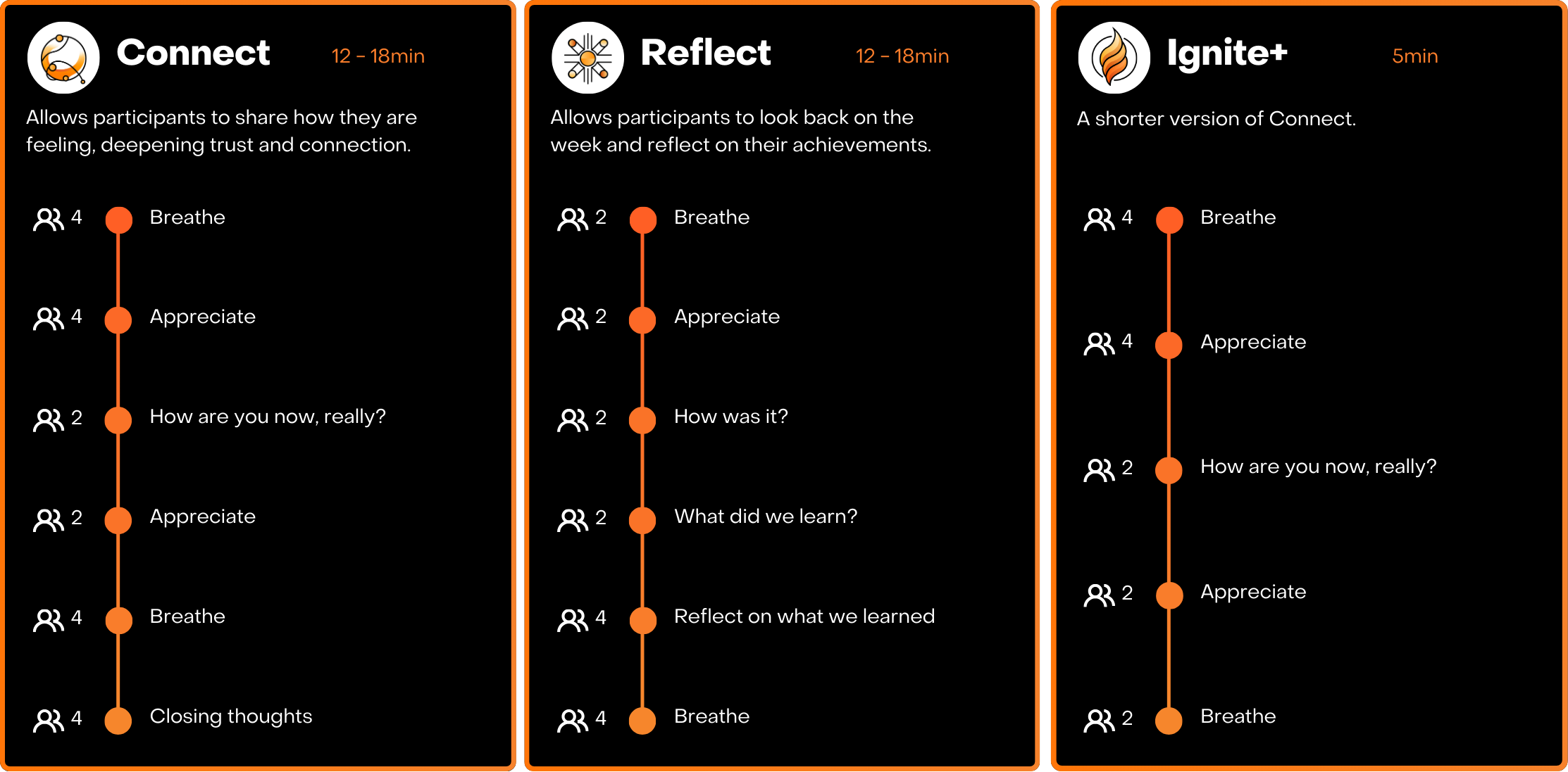 Replace most shorter daily Ignite+ check-ins with a single midweek Connect to deepen, not just touch, the relationship fabric