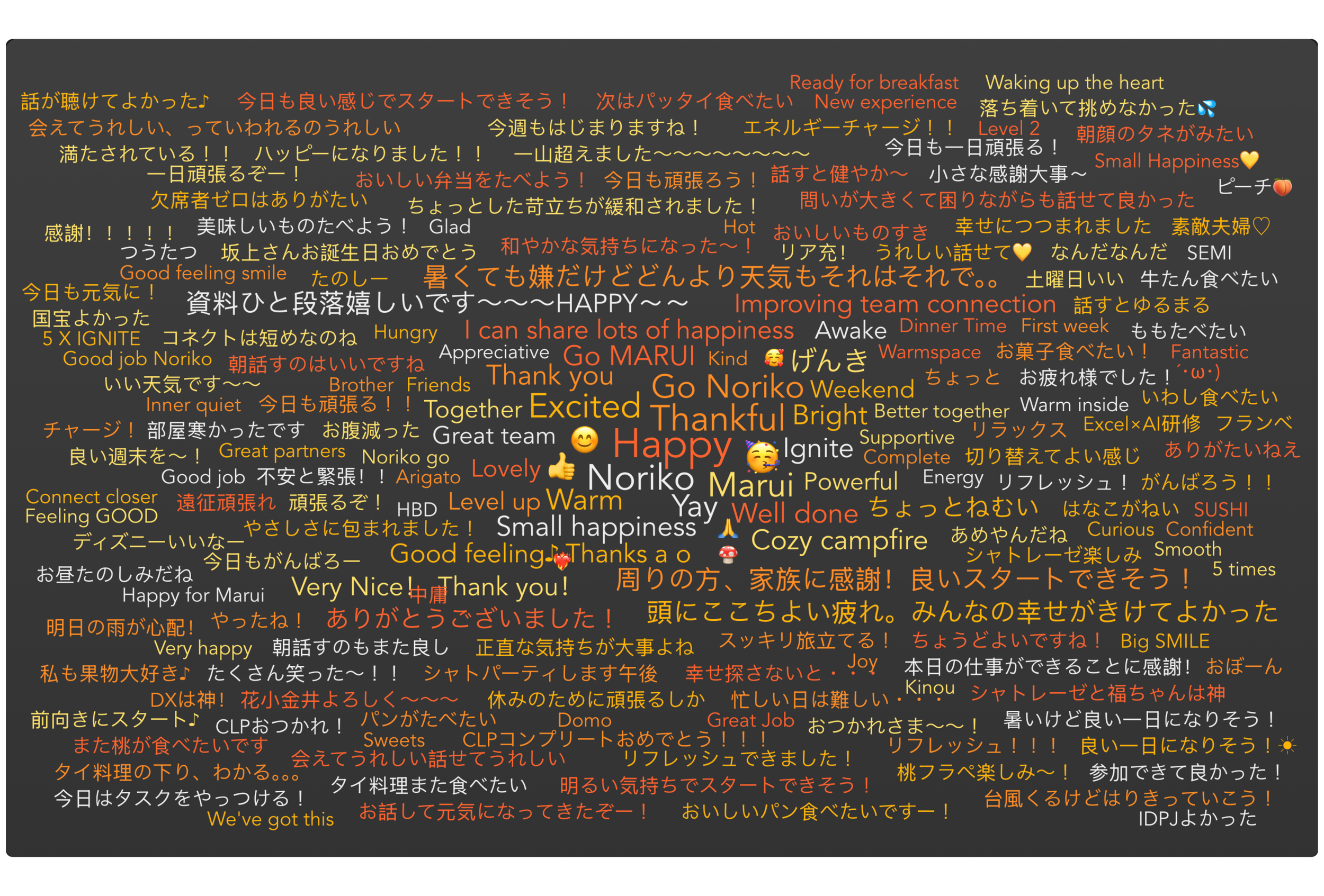 Marui’s world cloud and before & after energy scores from the 2-month POC.