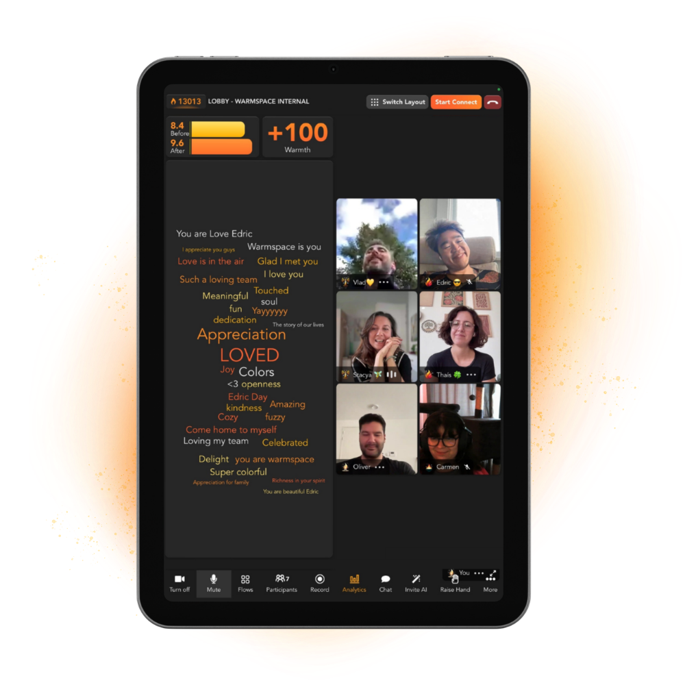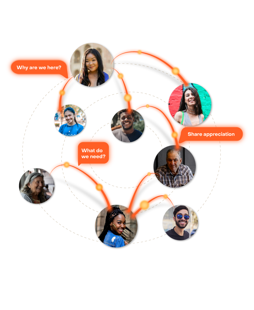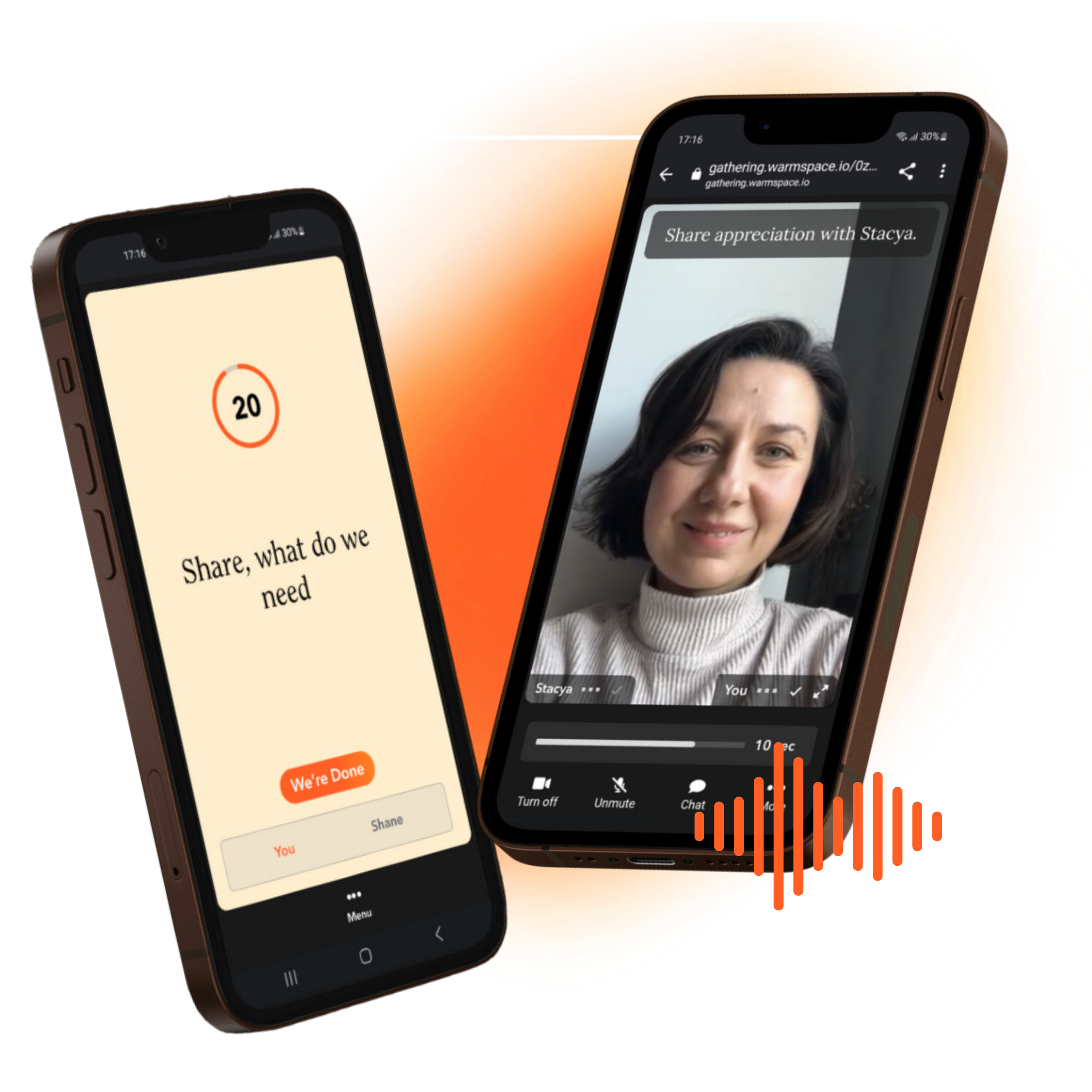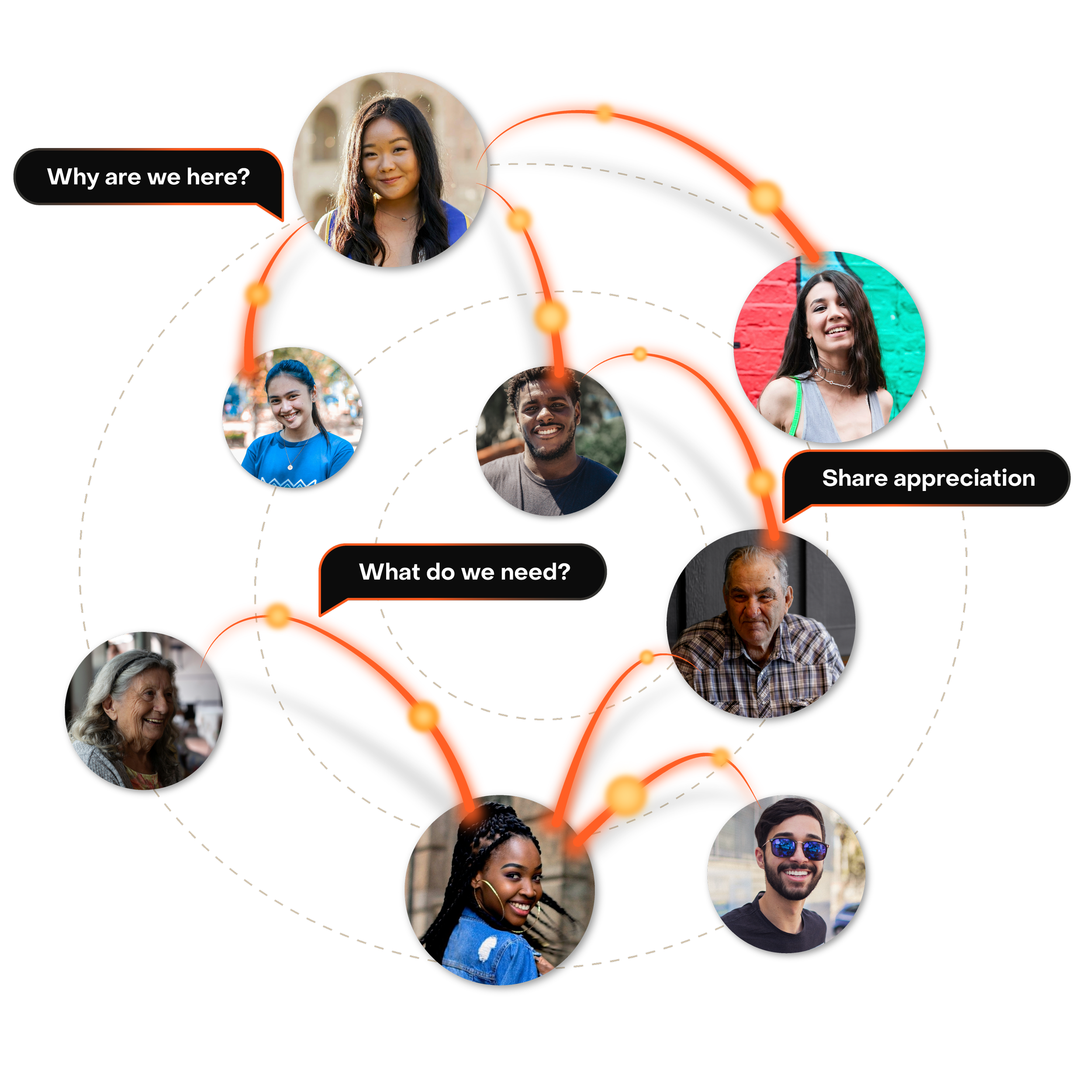 Warmspace connects your people in small groups via video calls or in person, guiding them through meaningful, science-backed conversations with structured interaction protocols. Each person is given a turn to speak, a chance to be heard, and the support to show up as their true selves. This fosters strong bonds, deep belonging, and transforms every community member into a loyal, engaged contributor.